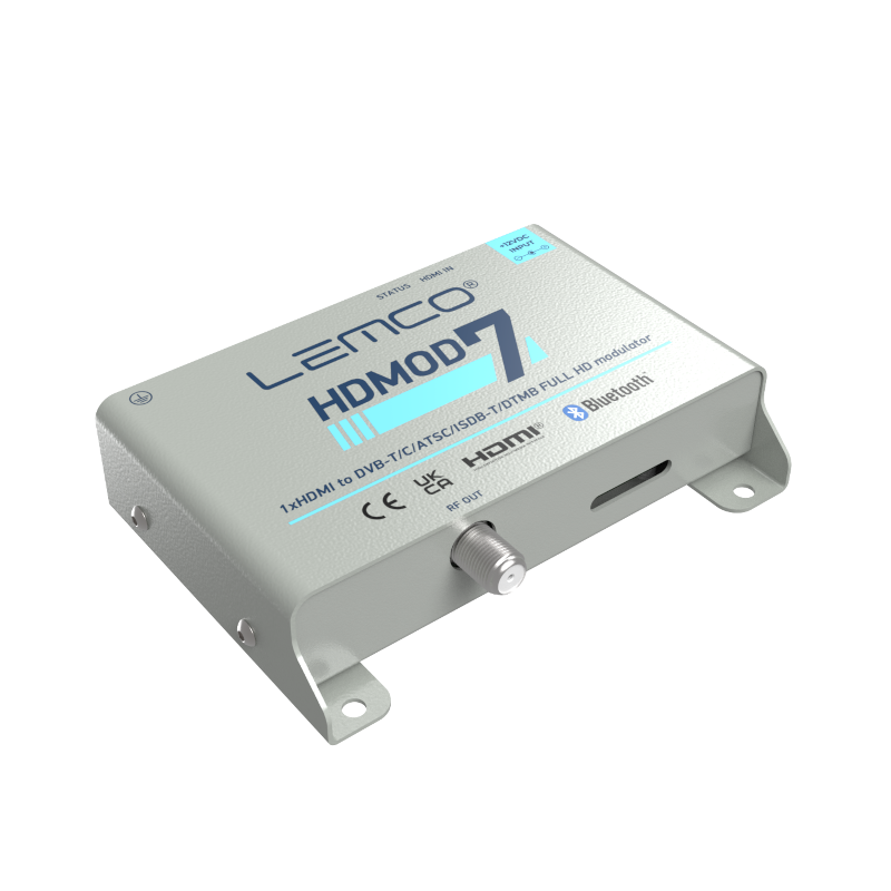 HDMOD-7 to kompaktowy modulator HDMI Full HD z enkodowaniem H.264 (do 20 Mbps), obsługą standardów DVB-T/C, ATSC, ISDB-T i DTMB, sterowaniem przez aplikację Bluetooth oraz wyjściem RF 50–950 MHz (do 90 dBµV).