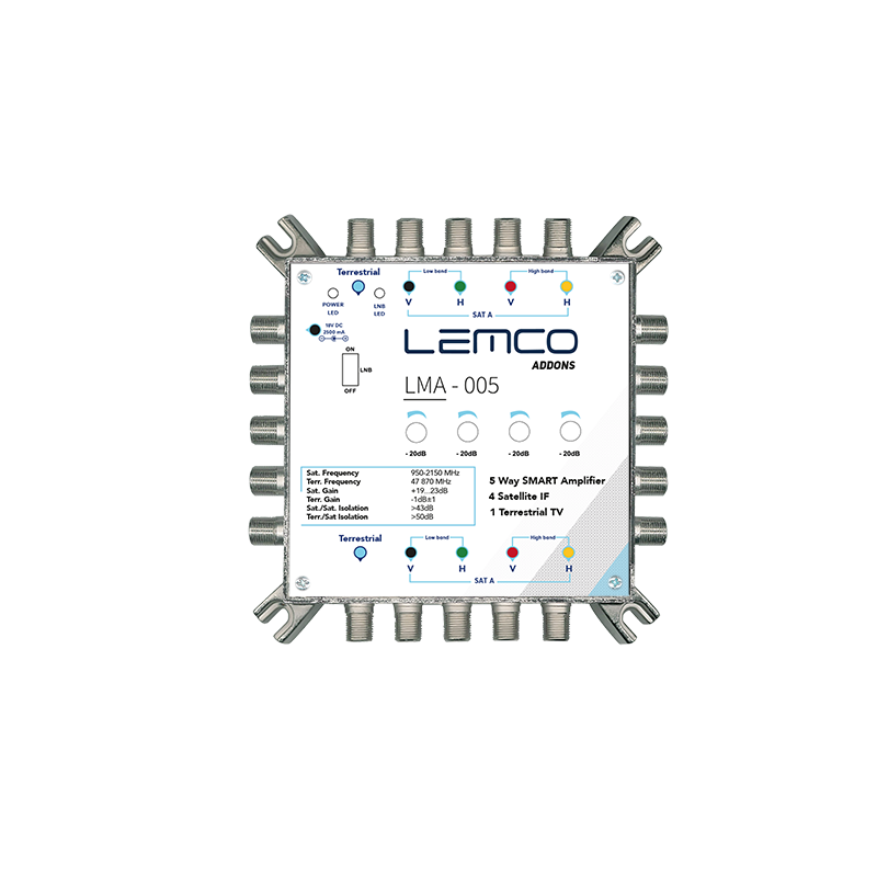LMA-005 to profesjonalny wzmacniacz przeznaczony do stosowania w kaskadowych instalacjach multiswitchowych (5-wejść). Zaprojektowany z myślą o stabilnym wzmocnieniu sygnału SAT oraz zachowaniu wysokiej separacji pomiędzy torami, oferuje doskonałą wydajność w kompaktowej obudowie z ZAMAKu. Urządzenie obsługuje Single, Quad oraz Quattro LNB, posiada wejścia typu F (żeńskie) o impedancji 75 Ω oraz zasilanie +18 V DC (zewnętrzne). Kluczowe cechy: wysoki zakres częstotliwości SAT 950–2150 MHz, zakres TER 47–870 MHz, maksymalny sygnał wejściowy SAT 110 dBμV oraz wzmocnienie SAT +19…23 dB (TER około -1 dB ±1). LMA-005 jest przeznaczony do profesjonalnych instalacji TV satelitarnej, gdzie ważna jest niezawodność, wysoka izolacja pomiędzy torami (SAT–SAT >43 dB, SAT–TER >50 dB) oraz łatwość montażu dzięki niewielkim wymiarom i solidnej obudowie.