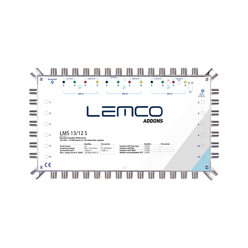 LMS-1312 S to wydajny multiswitch serii 13 przeznaczony do rozdziału sygnału satelitarnego dla maksymalnie 12 abonentów. Urządzenie wykorzystuje nowej generacji komponenty zapewniające wysoką izolację między portami, pracę przy niskich poziomach sygnału oraz minimalne zużycie energii dzięki zastosowaniu zewnętrznego źródła zasilania (SMPS). Obudowa wykonana w całości z ZAMAK-u gwarantuje znakomitą odporność mechaniczną i ekranowanie elektromagnetyczne, co sprawdza się w trudnych warunkach instalacyjnych.
