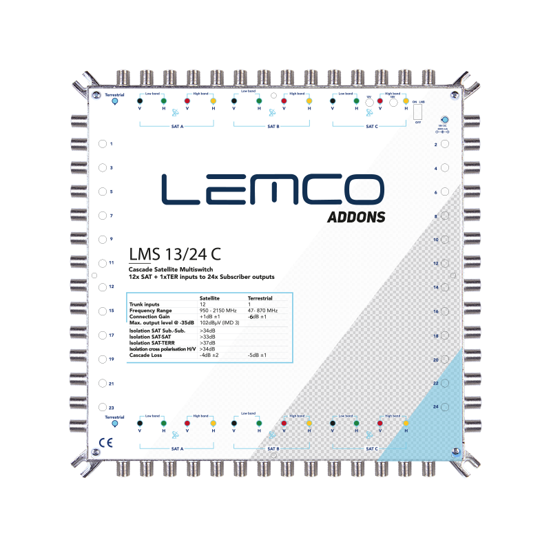 Multiswitch LMS-1324 C to niezawodne rozwiązanie do rozdziału sygnału satelitarnego i naziemnego w instalacjach DVB-S/S2 i DVB-T. Urządzenie obsługuje Single, Quad oraz Quattro LNB, oferuje doskonałą izolację między portami oraz niskie zużycie energii przy użyciu zewnętrznego zasilacza SMPS (zasilacz nie jest dołączony). Solidna obudowa wykonana z ZAMAK zapewnia wysoką trwałość i ekranowanie elektromagnetyczne, co czyni LMS-1324 C odpowiednim do pracy w trudniejszych warunkach. Przeznaczony jest dla 24 abonentów, umożliwia kaskadowanie (12+1 wyjść SAT+TER) i dostarcza stabilne, wysokie poziomy sygnału przy minimalnych stratach. Kluczowe cechy: obsługa różnych typów LNB, kompaktowy rozmiar, wytrzymała metalowa obudowa, możliwość kaskadowania, kompatybilność z komendami 13/18 V, 0/22 kHz, DiSEqC 2.0 i Toneburst VDC. Szczegółowa specyfikacja techniczna dostępna poniżej.