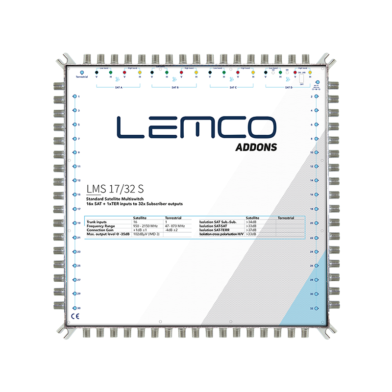 LMS-1732 S to niezawodny multiswitch serii 17 przeznaczony do instalacji satelitarnych SMATV i systemów zbiorowych. Urządzenie obsługuje Single, Quad i Quattro LNB, pracuje przy niskich poziomach sygnału przy zachowaniu wysokiej izolacji między portami oraz niskim zużyciu energii dzięki zastosowaniu zasilacza SMPS. Solidna obudowa wykonana w technologii ZAMAK zapewnia doskonałą odporność mechaniczną, skuteczne ekranowanie elektromagnetyczne oraz długą żywotność w trudnych warunkach. Zewnętrzny zasilacz +18VDC i możliwość przesyłu poleceń przełączania (13/18V, 0/22kHz, DiSEqC 2.0, Toneburst VDC) czynią LMS-1732 S uniwersalnym rozwiązaniem dla instalatorów.