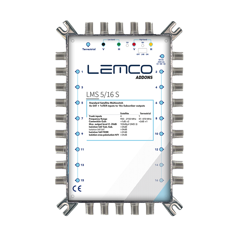 LMS-516 S to 5×16 multiswitch LEMCO z zasilaczem zewnętrznym, obudową ZAMAK, obsługą Single/Quad/Quattro LNB oraz 16 wyjściami dla abonentów.