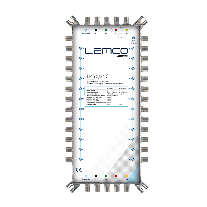 Lemco LMS-524 C to wysokiej jakości multiswitch z serii 5 przeznaczony do rozdziału sygnału satelitarnego i naziemnego dla maksymalnie 24 abonentów. Urządzenie wykorzystuje komponenty nowej generacji zapewniające niezawodność portów, pracę przy niskich poziomach sygnału, wysoką izolację między torami oraz niskie zużycie energii dzięki zastosowaniu układu zasilania typu SMPS (zasilacz zewnętrzny, nie dołączony). Solidna obudowa wykonana z ZAMAK gwarantuje wytrzymałość mechaniczną oraz skuteczne ekranowanie elektromagnetyczne nawet w trudnych warunkach instalacyjnych.