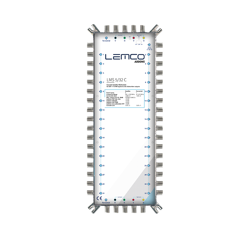 LMS-532 C to wysokiej jakości multiswitch serii 5 firmy LEMCO, zaprojektowany do rozprowadzania sygnału satelitarnego i naziemnego dla dużej liczby abonentów. Urządzenie obsługuje Single, Quad oraz Quattro LNB, oferuje kompaktową obudowę wykonaną z ZAMAK zapewniającą wytrzymałość i skuteczne ekranowanie elektromagnetyczne. Dzięki zastosowaniu nowej generacji komponentów multiswitche serii 5 cechują się niskim poborem mocy, wysoką izolacją między portami oraz pracą przy niskim poziomie sygnału. LMS-532 C posiada 32 wyjścia dla abonentów oraz możliwość kaskadowania z innymi urządzeniami (4+1 wyjścia kaskadowe). Urządzenie wymaga zewnętrznego zasilacza +18 VDC (zasilacz nie jest dołączony). Zastosowanie złączy typu F i impedancji 75 Ω ułatwia integrację z istniejącymi instalacjami sat/ter. Poniżej znajduje się szczegółowa specyfikacja techniczna.