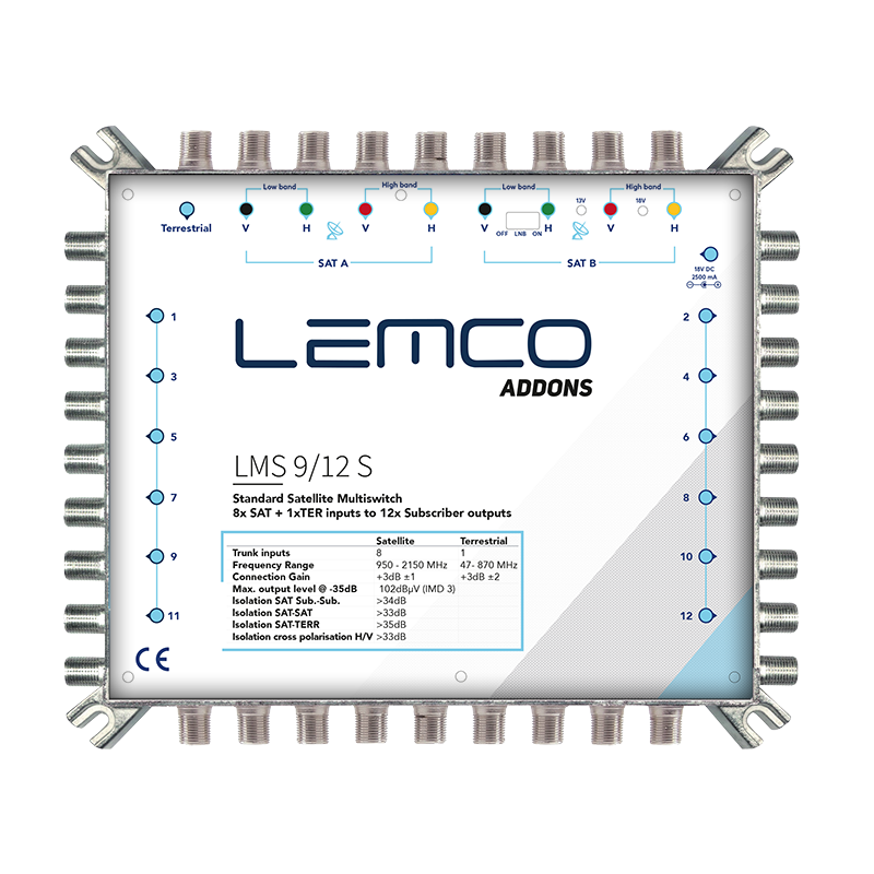 LMS-912 S to kompaktowy multiswitch 9x9x12 Lemco, obsługujący Single/Quad/Quattro LNB, z wytrzymałą obudową ZAMAK i zewnętrznym zasilaczem.