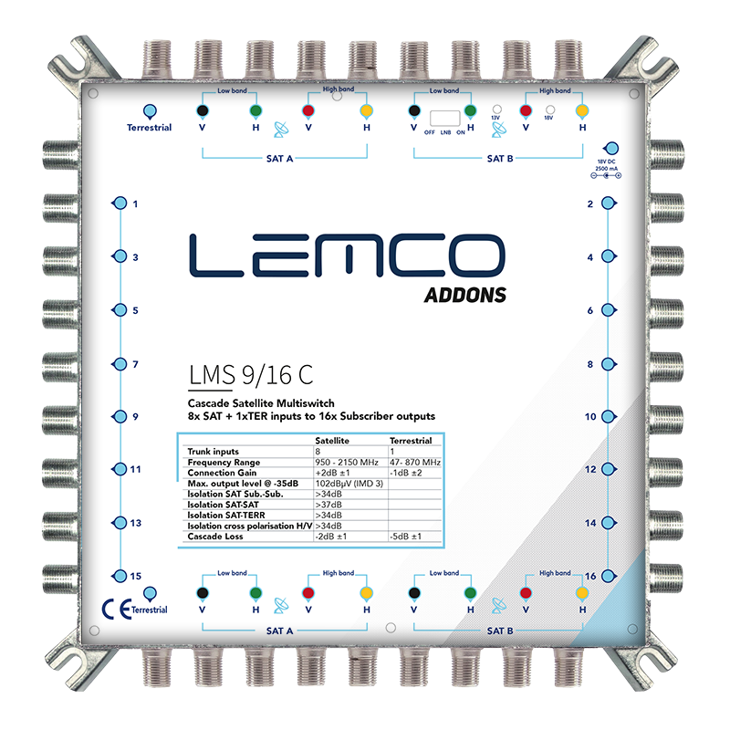 LMS-916 C to profesjonalny multiswitch serii 9 przeznaczony dla instalacji satelitarnych wymagających niezawodnego rozdziału sygnału dla wielu abonentów. Urządzenie obsługuje Single, Quad oraz Quattro LNB, gwarantując elastyczność przy różnych typach instalacji. Zastosowanie elementów nowej generacji zapewnia minimalne ryzyko awarii portów, poprawioną pracę przy niskich poziomach sygnału oraz wysoką separację między portami. Obudowa wykonana z ZAMAK zapewnia trwałość, odporność na trudne warunki środowiskowe oraz doskonałe ekranowanie elektromagnetyczne. Multiswitch wymaga zewnętrznego zasilacza +18VDC (PSU nie jest dołączony). Poniżej znajdują się kluczowe parametry techniczne produktu.