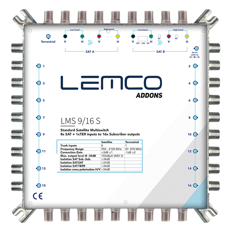 LMS-916 S to profesjonalny multiswitch serii 9 przeznaczony do dystrybucji sygnału satelitarnego i naziemnego dla maks. 16 abonentów. Urządzenie obsługuje Single, Quad oraz Quattro LNB, oferując doskonałą wydajność przy niskich poziomach sygnału dzięki nowej generacji komponentów zapewniających minimalne ryzyko awarii portów. Solidna, odlewana obudowa z ZAMAK gwarantuje wysoką odporność mechaniczną i znakomite ekranowanie elektromagnetyczne, co czyni sprzęt odpowiednim do pracy w wymagających warunkach. Zastosowane zasilanie SMPS przekłada się na niższe zużycie energii, a zewnętrzny zasilacz ułatwia montaż i serwisowanie.