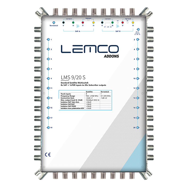 LMS-920 S to wydajny multiswitch satelitarny serii 9, zaprojektowany do dostarczania sygnału dla maksymalnie 20 abonentów. Urządzenie obsługuje konfiguracje Single, Quad i Quattro LNB, pracuje przy niskich poziomach sygnału, oferując jednocześnie wysoką izolację między portami oraz niskie zużycie energii dzięki zastosowanemu zasilaczowi impulsowemu (SMPS). Solidna, metalowa obudowa wykonana z ZAMAK zapewnia podwyższoną odporność mechaniczną oraz skuteczne ekranowanie elektromagnetyczne, co czyni LMS-920 S idealnym rozwiązaniem do instalacji komercyjnych i wielorodzinnych.