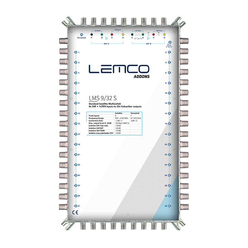 LMS-932 S to profesjonalny multiswitch 9×32 zaprojektowany dla instalacji satelitarnych wymagających niezawodności i stabilnej dystrybucji sygnału. Urządzenie obsługuje Single, Quad i Quattro LNB, zapewnia doskonałe parametry pracy przy niskich poziomach sygnału oraz wysoką izolację między portami, co minimalizuje przenikanie i zakłócenia. Obudowa wykonana z ZAMAK gwarantuje trwałość, odporność na warunki zewnętrzne i skuteczne ekranowanie elektromagnetyczne. Zasilanie realizowane jest przez zewnętrzny zasilacz +18 VDC z niskim poborem energii (SMPS), co obniża zużycie i podnosi niezawodność instalacji.