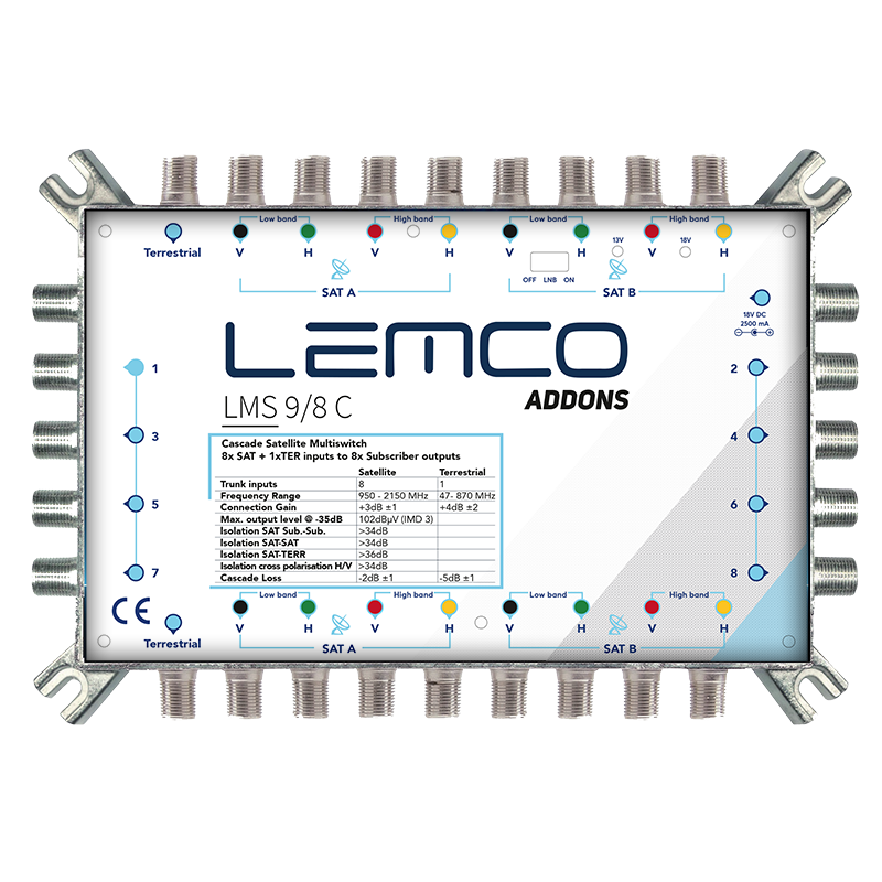 LMS-98 C to wydajny multiswitch serii 9, zaprojektowany z myślą o rozbudowanych instalacjach satelitarnych. Urządzenie obsługuje konfiguracje Single, Quad oraz Quattro LNB, umożliwiając dystrybucję sygnału SAT i TER do 8 abonentów (konfiguracja 9x9x8). Dzięki zastosowaniu nowej generacji komponentów multiswitch zapewnia minimalne ryzyko awarii portów, pracę przy niskich poziomach sygnału, wysoką separację między portami oraz niskie zużycie energii przy wykorzystaniu zewnętrznego zasilacza SMPS. Obudowa wykonana z ZAMAK gwarantuje trwałość, odporność na warunki zewnętrzne oraz skuteczne ekranowanie elektromagnetyczne. PSU nie jest dołączony (zasilacz +18VDC należy dokupić osobno).
