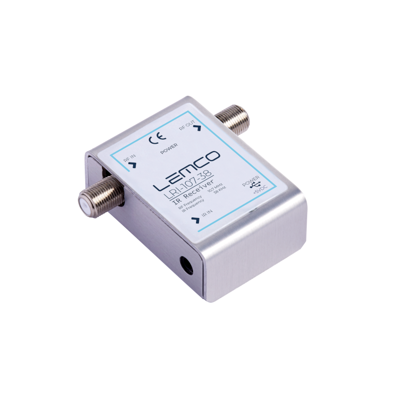 LRI-107-038 to kompaktowy odbiornik IR firmy Lemco do przesyłu poleceń pilota przez instalację koncentryczną – wysokie wyjście RF 113 dBμV, czuły odbiór IR, zasilanie micro USB.